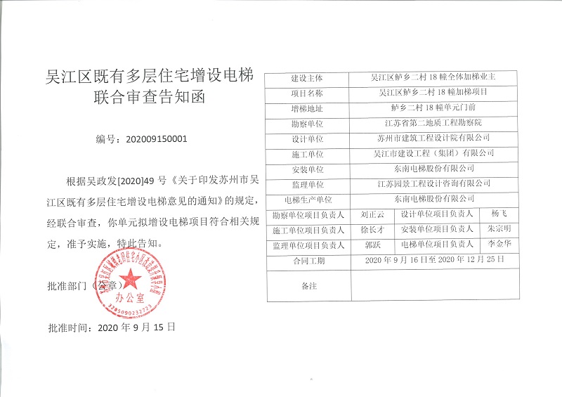 為更好地服務(wù)于吳江區(qū)既有多層住宅增設(shè)電梯工作,根據(jù)《蘇州市吳江區(qū)既有多層住宅增設(shè)電梯實(shí)施意見(jiàn)》及《吳江區(qū)既有多層住宅增設(shè)電梯聯(lián)合審查試行辦法》精神,我司積極響應(yīng)政策要求參與其中。由區(qū)住建局牽頭組織專(zhuān)家小組對(duì)參建單位資格等方面進(jìn)行審查、并向社會(huì)公示,形成推薦單位,我司成功入圍電梯加裝單位。