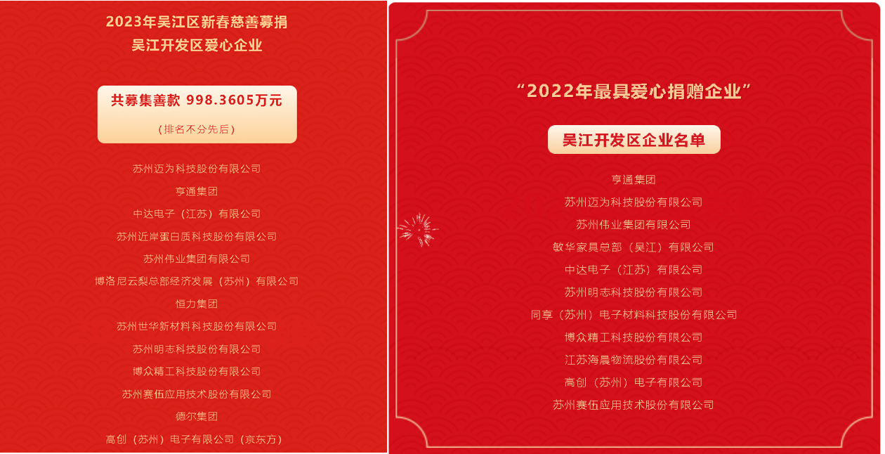 同心協(xié)力,愛心捐贈又一年。2022年12月28日,吳江區(qū)召開設(shè)區(qū)十周年大會暨新春座談會。2012年10月,吳江撤市設(shè)區(qū),全面融入蘇州主城區(qū);2019年11月,吳江全域納入長三角生態(tài)綠色一體化發(fā)展示范區(qū)。開放帶來更多競爭,本地企業(yè)有限市場空間被擠壓,集團于夾縫中求生存,克服千難萬難求發(fā)展,勇于創(chuàng)新、勇于奉獻,集團領(lǐng)導在本次活動中捐款100萬元,企業(yè)被評為“吳江區(qū)2022年最具愛心捐贈企業(yè)”、“2023年吳江區(qū)新春慈善募捐吳江開發(fā)區(qū)愛心企業(yè)”。